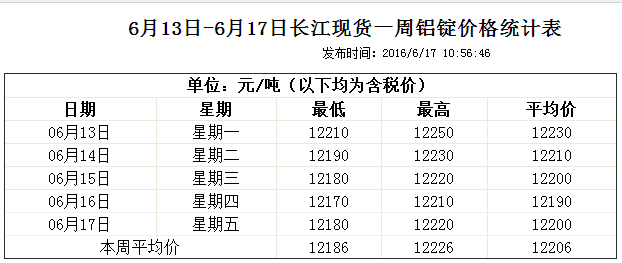 6月13号-6月17号 长江现货一周铝锭价格统计表